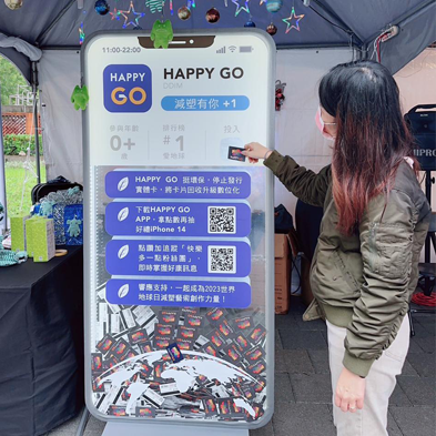 近年來全球暖化和極端氣候日益加劇,聯合國和各國政府推動淨零排放政策,不少企業也紛紛推動ESG投入永續環保行動。2022年宣示一系列「Let’s HAPPY GO改變多一些 快樂多一點」企業永續倡議行動,以「減塑多一點、減碳多一點、走路多一點」為三大面向推動短中長期計畫,首發任務即承諾即日起不再主動發行塑膠卡面的實體會員卡。HAPPY GO同步邀請全台千萬卡友和合作特約店家通路一起行動支持,以下載HAPPY GO App取代原本的實體卡片,不僅可享受方便即時的數位體驗,還能減少塑料使用、落實環保。