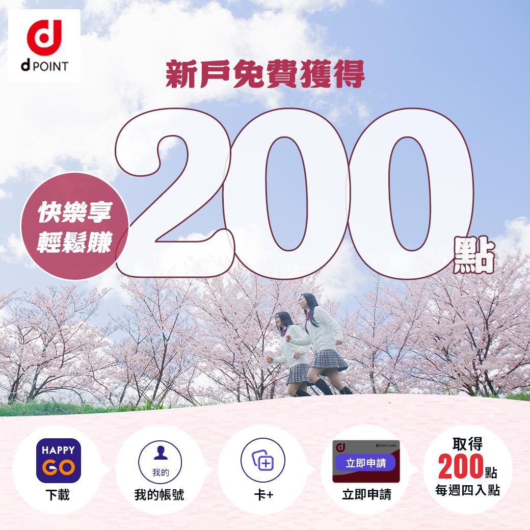 d POINT為日本NTT DOCOMO集團內之點數事業體,在日本的d POINT特約商家消費,每100日元可累1 d POINT,每1 d POINT可折抵1日元。合作店家遍及全日本,如:松本清藥妝、Lawson便利商店、Mcdonald’s、Tokyu Hands等知名品牌,同時也深受台灣旅客喜愛。