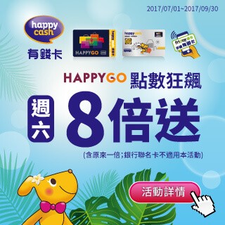 每週六於全台遠東百貨、太平洋SOGO百貨、新竹巨城購物中心,使用HappyCash有錢卡支付消費單筆消費滿$2,000; 全台愛買、city’super 使用HappyCash有錢卡支付消費單筆消費需滿$1,000,享HAPPY GO點數8倍送(含原本一倍)。