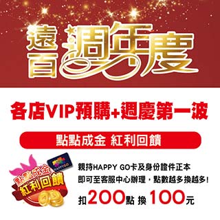HAPPY GO點點變現金,35點可折抵10元,折抵無上限。詳細活動內容請上Big City遠東巨城購物中心網站查詢