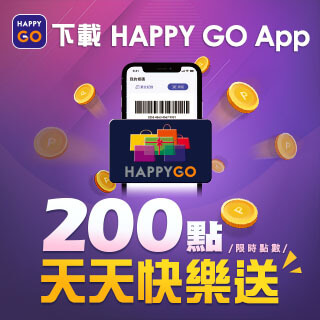(1) 首次下載App:首次下載HAPPY GO App並完成會員登入,送100點限時點數!(每一會員限得一次)