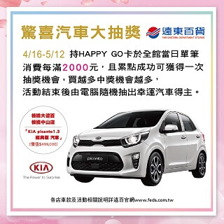 ‧ 持HAPPY GO卡於全館當日單筆消費每滿2000元,且累點成功可獲得一次抽獎機會,買越多中奬機會越多,活動結束後由電腦隨機抽出幸運汽車得主。