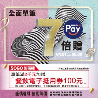 活動方式:活動期間於SOGO百貨使用HG Pay單筆滿2千元加贈100元餐飲電子抵用券。(全台限量8,000份,每卡/每日/每館限贈壹次,數量有限贈完為止)※使用期間:即日起~2021/6/30(三),逾期無效※使用範圍:SOGO百貨各店大型餐廳(含喫茶)-抵用券全台流通