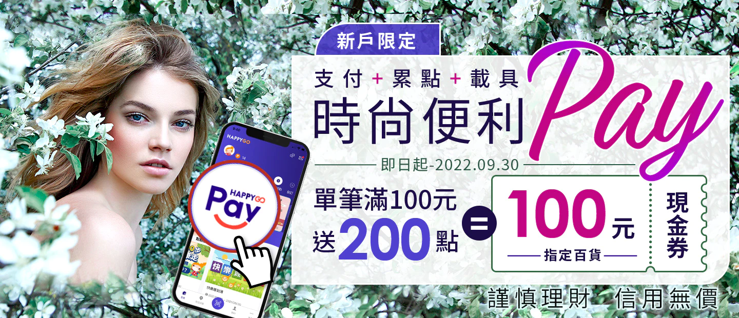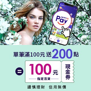 ●活動內容:活動期間HAPPY GO Pay新戶於指定通路單筆首刷$100送200點限時點數(價值等同於指定百貨100元現金券)