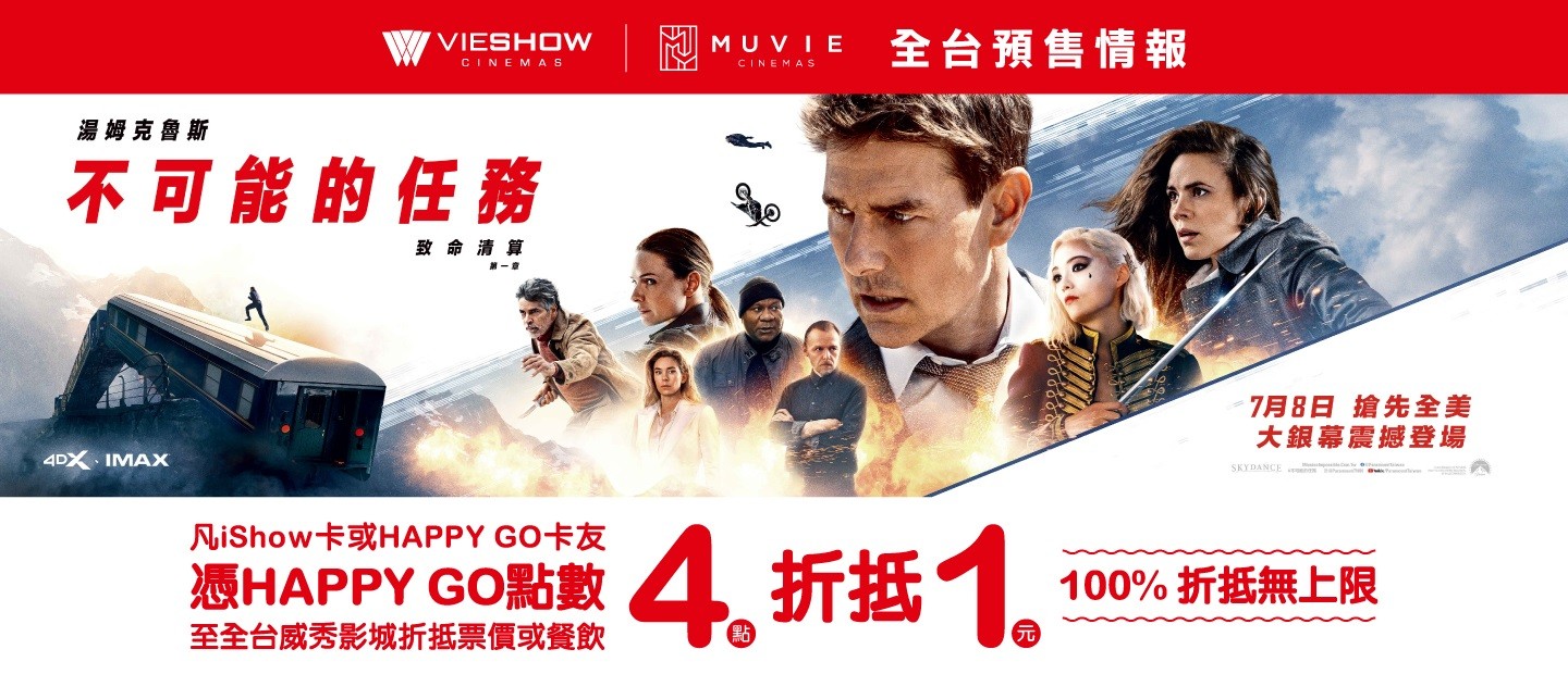 ●電影場次預售開放時間:06/29 (四)中午12:00過後開放《不可能的任務:致命清算第一章》07/08(六)-07/10(一)之部分場次預售。 (線上購票於中午12:00-12:30開放售票系統)