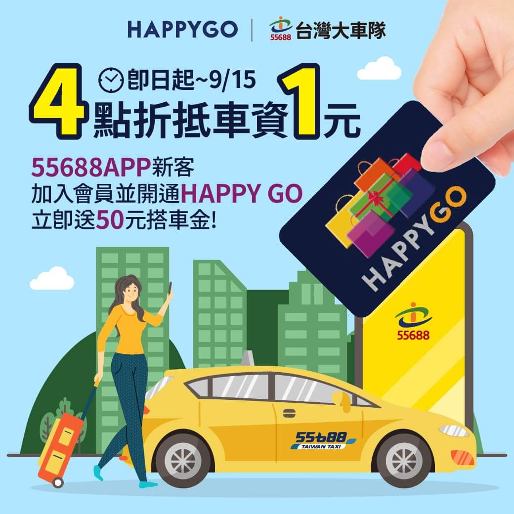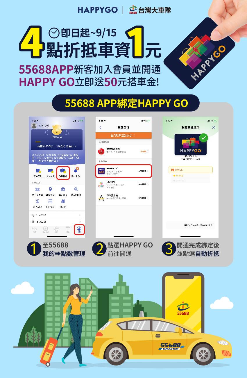 8/21-9/15 完成綁定,HAPPY GO購物金於9/19發放HG200點(限量前50名)+ 55688 APP新客加碼發送50元新客乘車金(限量前3,000名)