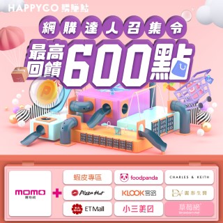 (8) HAPPY GO購賺點指定品牌:臺灣樂天市場、東森購物網、家樂福、 Yahoo奇摩購物中心、Pinkoi、日藥本舖、小三美日、札幌藥妝、86小舖、UNT國際美妝、i3Fresh愛上新鮮、蔥媽媽美食生活館、糖鼎黑糖、瑪莉屋口袋比薩、快車肉乾、塔吉特、法布甜、諾貝爾食品、香帥蛋糕、OB嚴選、Nike、A.S.O阿瘦皮鞋、FILA、Keds、Life8、Dyson戴森、窩在家、南法香頌、Norns、鈴木太太、KLOOK客路、KKday旅遊體驗平台、小獅王辛巴、Hahow好學校、三十日、樂齡網、義美生醫、旅行必需、必勝客、肯德基、鍋寶好食光、樂扣樂扣、CASETiFY手機保護殼、Wstyle、MaoBao2毛寶兔宅配網、Uber Eats-新客首購等、依蕾特布丁、紅磚布丁、白蘭氏健康Mall、Better Biosciences 好好生醫、ALLSAINTS、Daniel Wellington、林貞粿行、島瓜滷味、老媽拌麵、TripAdvisor 旅遊社群、力奇寵物 Reki Pet、iHerb、羊角購物、好拾物、美麗焦點、Zenyum 綻雅、永真生技 Yung Chen 、Weider 威德保健品、DV 麗彤生醫、Angel LaLa 天使娜拉、你滋美得 NutriMate、funcare 船井生醫購物網、綠綠好日、蝦皮專區、foodpanda、葡萄王購健康、墊腳石、THE VEGAN 樂維根、RHINOSHIELD 犀牛盾、PiyoPiyo 黃色小鴨、ORBIS、MAJOR MADE、lululemon 露露檸檬、Kappa、ihergo 愛合購、HOTAI購、 ZALORA 台灣。