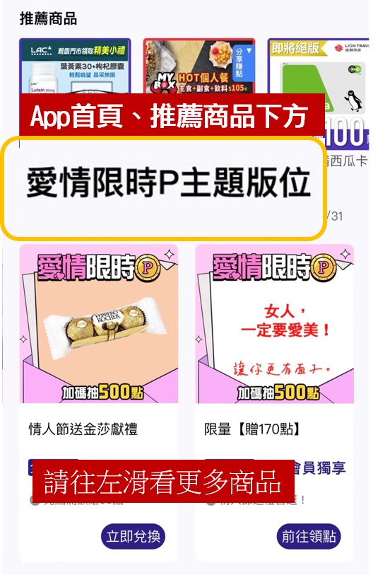 💰8/16-8/31愛情限時P主題專區消費、兌換任一商品可享點數回饋、折扣。