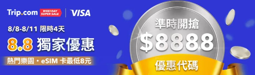 Trip.com這個星期由Visa冠名贊助,於8月8日推出VISA卡專屬高達NT$8,888的優惠代碼,