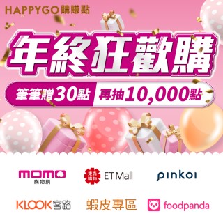 (10) 各通路優惠活動時間與優惠內容請依各通路官方網站實際公告為主;有效追蹤紀錄以HAPPY GO購賺點入口連結轉跳頁之說明為準。相關活動抽獎資格將依鼎鼎聯合行銷系統紀錄為主。鼎鼎聯合行銷(股)有限公司,保留變更或終止本活動之權利。