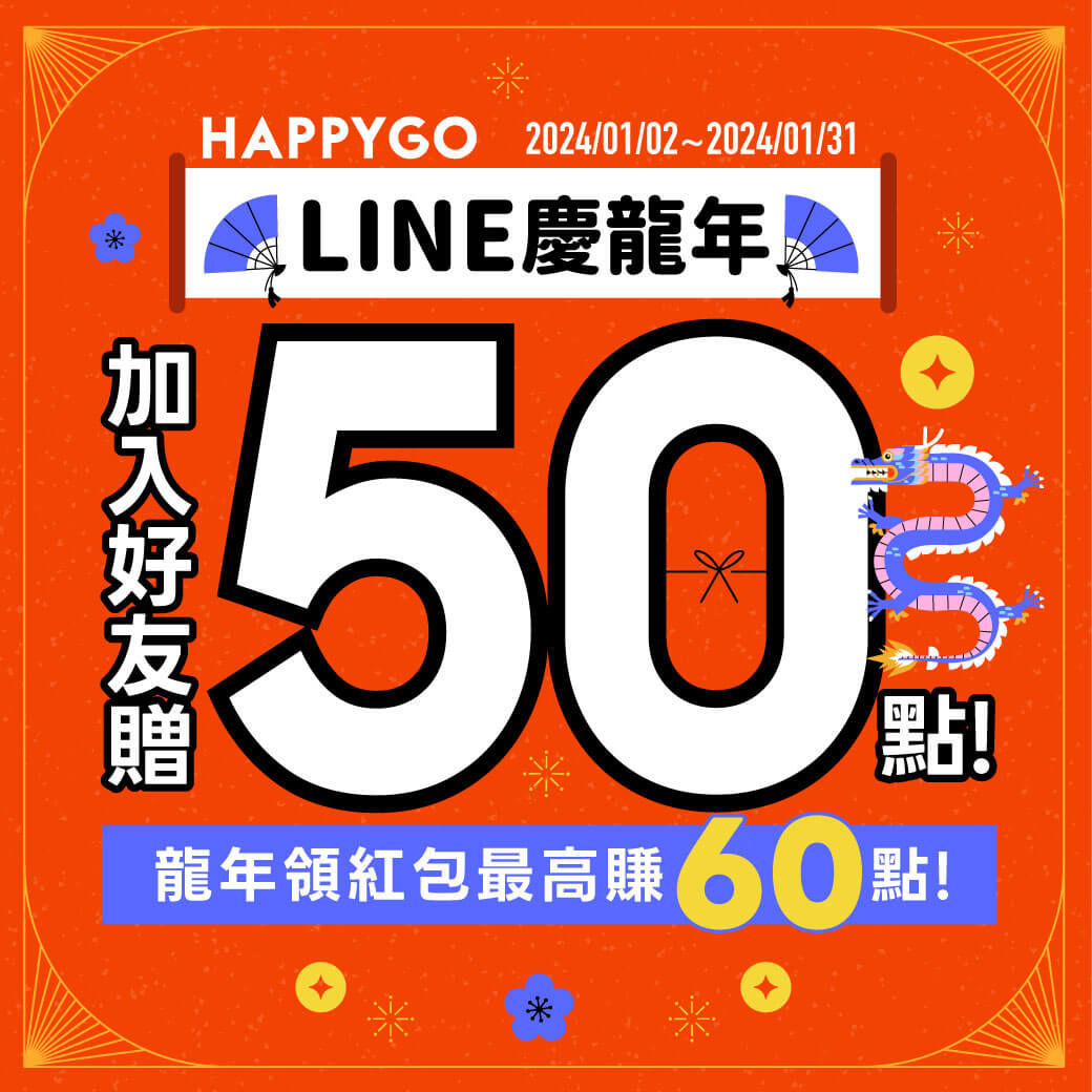 ► 第一重:完成HAPPY GO X LINE官方帳號 好友綁定『贈50點』! (限量前7,000名)
