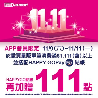 11/9 (六) ~ 11/11 (一) APP會員會員於愛買量販消費單筆滿 $1,111 (含) 以上,