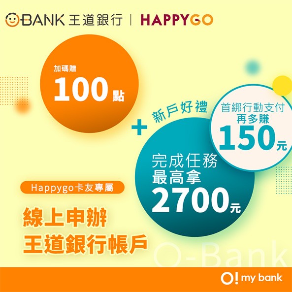 HAPPY GO卡友透過本活動頁專屬開戶連結成功開立王道銀行帳戶並啟用者,即可獲得100點HAPPY GO點數