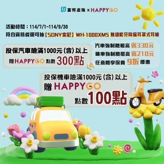 l 投保機車強制險同時加保任意險,保費滿 1,000元即 贈 HAPPY GO 100點。