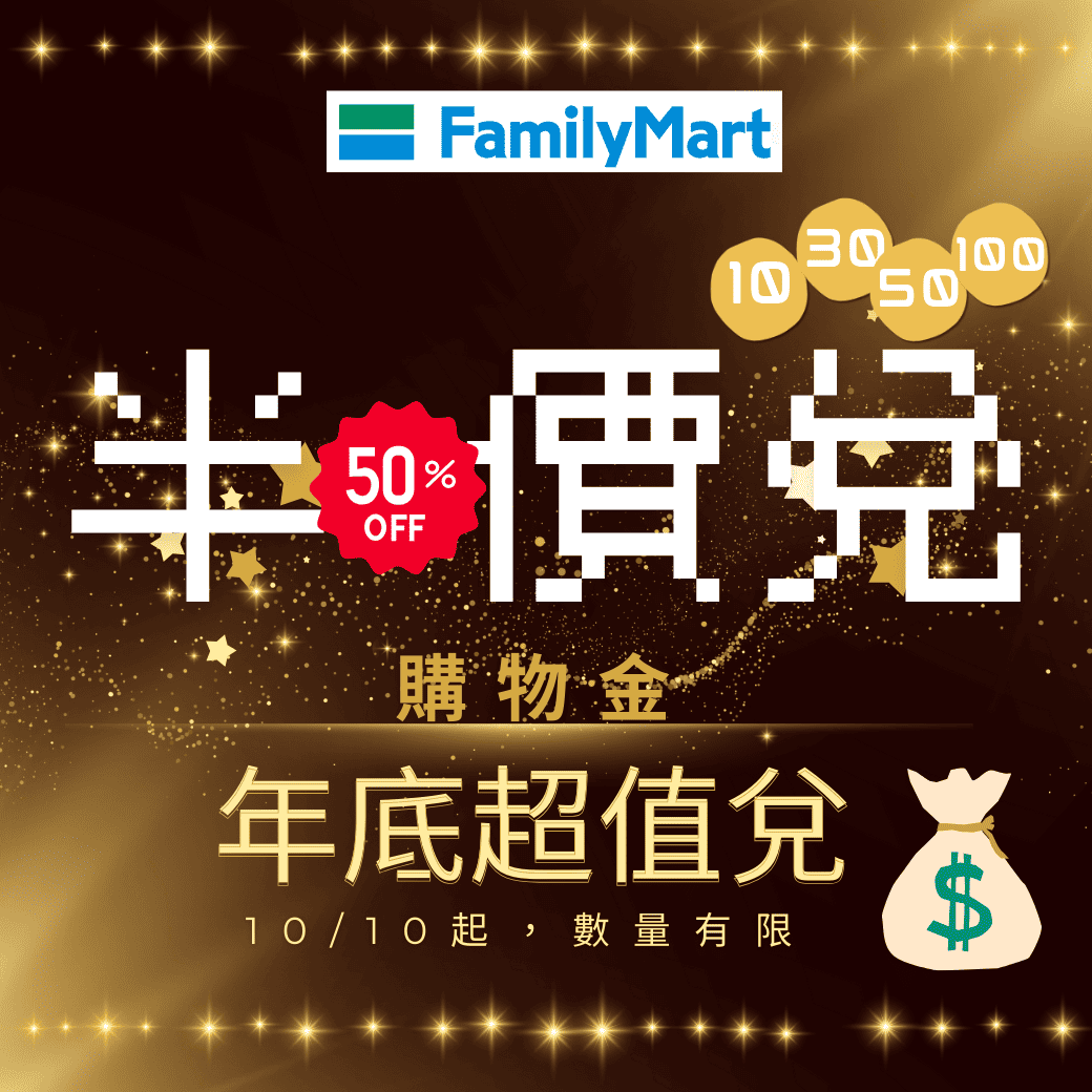 活動內容:活動期間,到 HAPPY GO APP 限時限量半價兌「全家購物金」