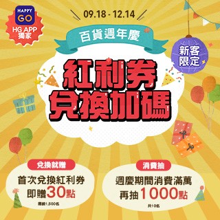 活動說明:新客首次於HAPPY GO APP兌換任一遠東百貨週年慶紅利券,即可加贈30點