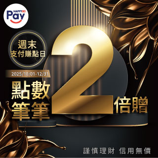 活動期間內每週六、日使用HAPPY GO Pay綁定之活動銀行信用卡,並於活動通路消費單筆滿100元(含)以上,即享HAPPY GO點數2倍贈(含原通路1倍) 限時點數