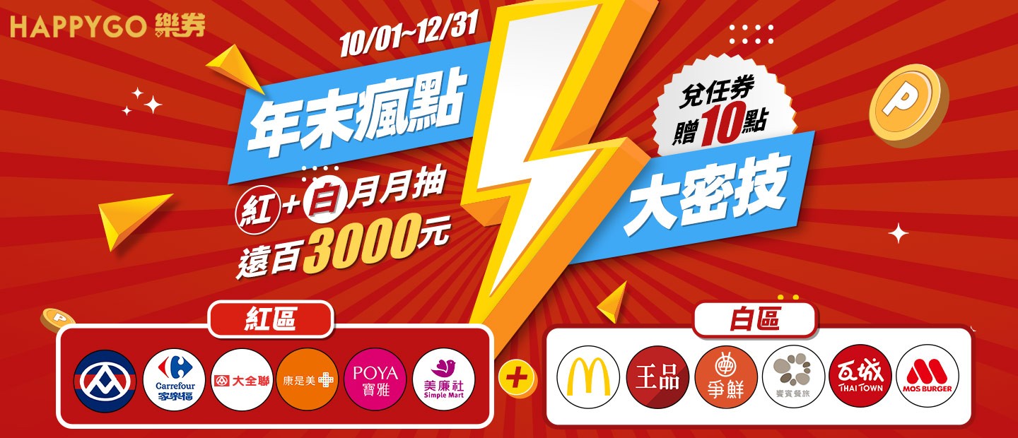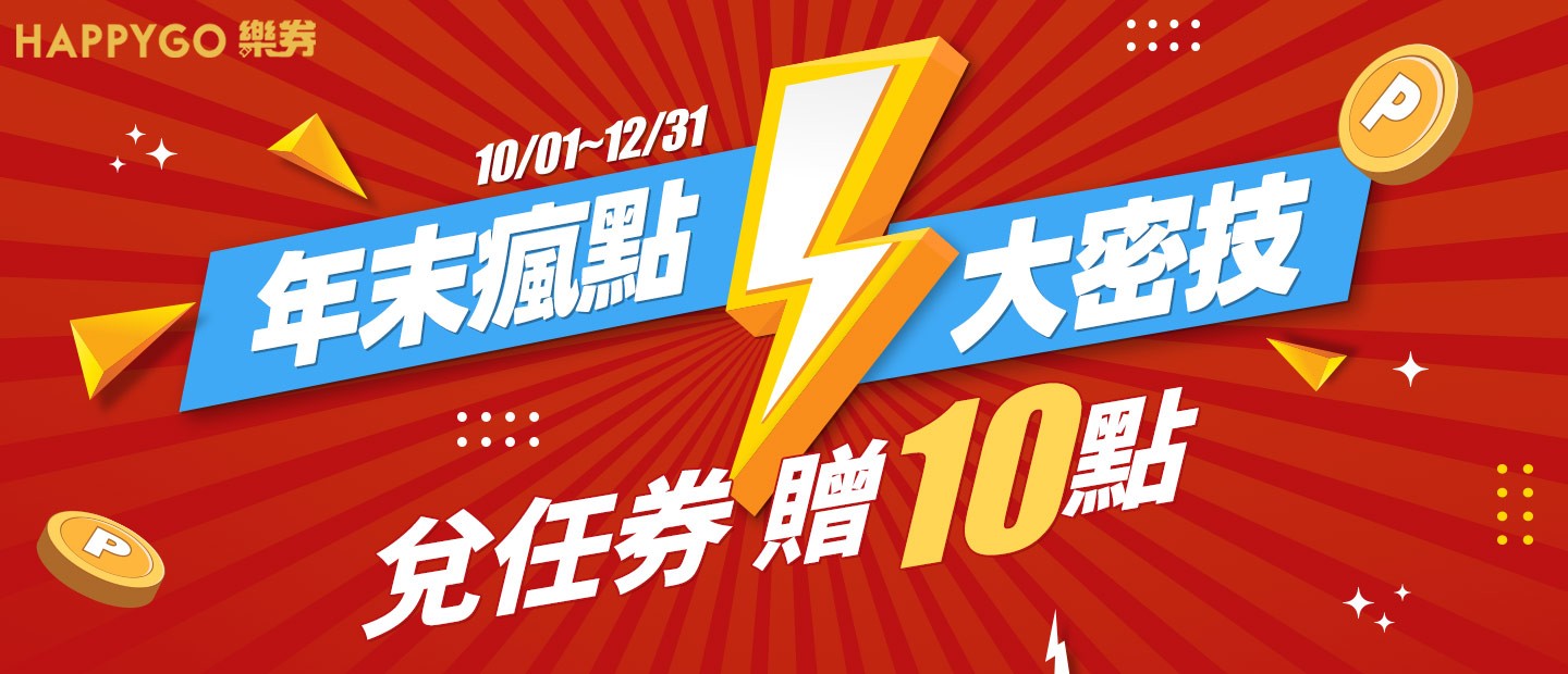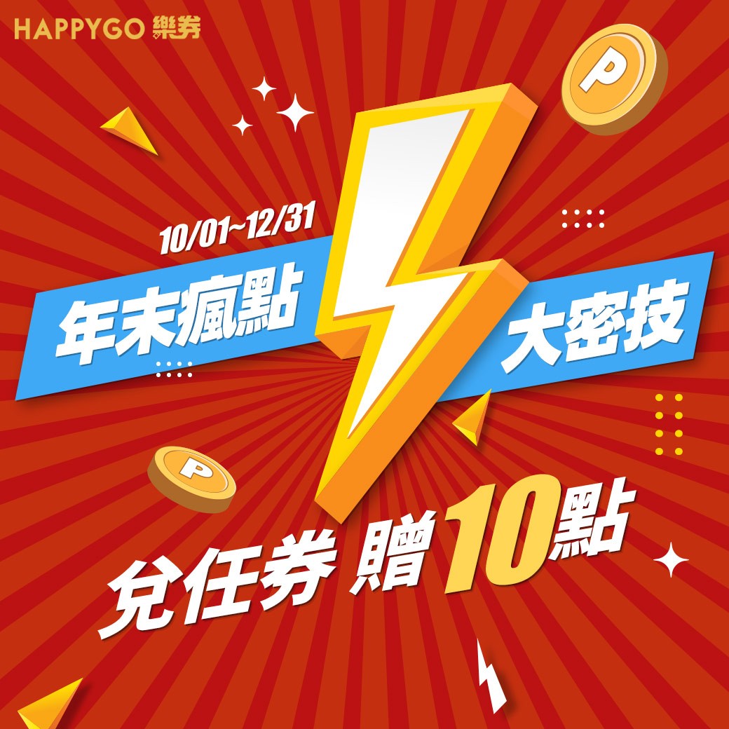 3.活動2:活動期間使用HAPPY GO點數兌換樂券贈10點,每人每月限參加1次,(10月共5,000名,11月共6,000名,12月共15,000名),本活動為累積型活動,依每月名額贈完為止。