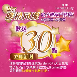 2025/10/13(一)~2025/12/8(一)活動期間新戶訂閱遠東Garden City大巨蛋店電子報,留下快樂購卡號並完成Email認證,即可獲得快樂購點數30點。