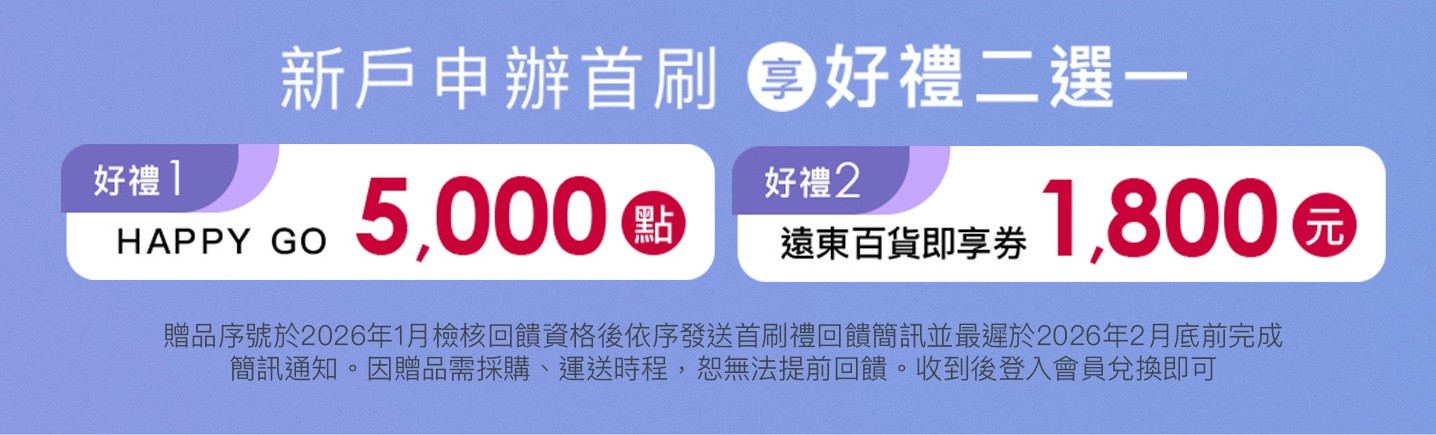 ■【Happy Go通路限定首刷禮】回饋與(或寄送)當日前,正卡申請人有以下情況者,即自動喪失參加本活動之資格,申請人所獲得之好禮回饋應於本行查明或知悉有該等情事時立即失效,申請人亦不得要求將好禮回饋折換現金或折抵消費金額。(1)信用卡(含正、附卡)遭強制停用、停卡、掛失不補發。(2)非持卡本人交易款項(如遺失被竊、偽卡交易、偽冒申請)。(3)持卡人有信用卡約定條款所列喪失期限利益等情事。