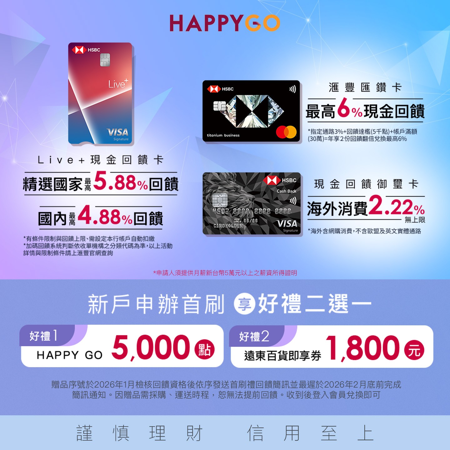 活動期間透過HAPPY GO指定活動頁面連結至滙豐銀行辦卡平台線上申辦滙豐Live+現金回饋卡、匯鑽卡或現金回饋御璽卡,並勾選電子帳單或行動帳單,並於核卡30天內註冊登入滙豐銀行信用卡行動App(HSBC Card+)、新增一般消費累積達$5,000元,可獲得通路限定首刷禮(多選一):