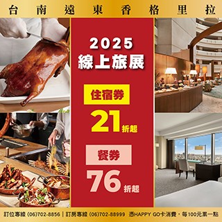 年終衝買氣,台南遠東香格里拉響應11月全台最大旅遊盛事,10月22日起至11月30日推出「2025線上旅展」,五款超值雙人住宿券,網羅熱門入住房型,超低優惠21折至3折;以及館內人氣餐廳,包括台南最高景觀餐廳「醉月樓」(38F)、聚餐首選自助式吃到飽餐廳「遠東Café」(10F)、以及「大大廳茶軒」(1F)紛紛獻上歷年熱銷優惠餐券,折扣76折起。活動期間,不限任何時刻、不限場地,進入線上票券商成指定連結:https://sltn.tw/OAKmJ,即可輕鬆購買。數量有限、售完為止!詳情請洽:(06)702-8888。