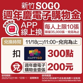 活動期間於SOGO APP線上扣300點即可兌換200元週年慶電子購物金壹張