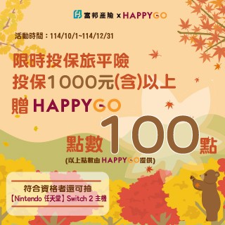 ● 投保富邦產險新版《國外旅遊不便險》(含法定傳染病),保費滿 1,000元即 贈 HAPPY GO 100點。