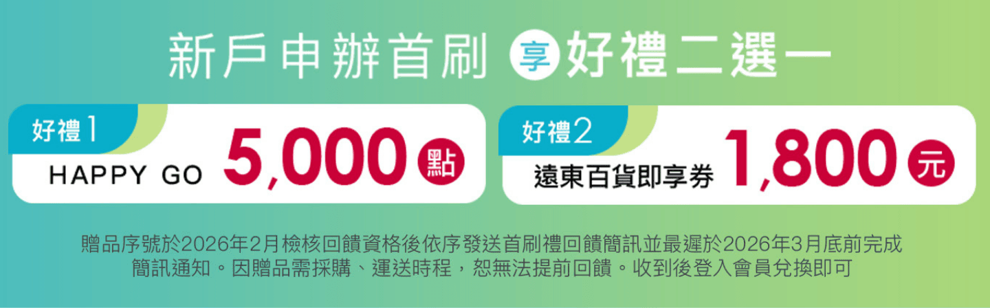 ■通路限定首刷禮將於2026年02月底檢核回饋資格後依序發送首刷禮回饋通知簡訊,並於2026年02月底前完成通知。因贈品需採購、運送時程,恕無法提前回饋,首刷禮回饋通知為傳送簡訊或電子郵件寄送兌換序號至正卡持卡人登錄於本行之電子郵件/手機號碼,收到簡訊後於2026年04月底前點選兌換連結並登入HAPPY GO會員選擇贈品,HAPPY GO將於一個月內完成入點或依留存於HAPPY GO會員中心之資料進行即享券序號派送。,如超過2026年04月底前未完成兌換,並遇贈品缺貨等不可抗拒之因素,將改為提供即享券等值刷卡金 。本活動提供之贈品皆由廠商提供,滙豐銀行與廠商間無合夥、經銷代理或保證關係,若因商品或服務發生之爭議皆由合作廠協助處理及負責相法律上責任,概與滙豐銀行無涉。