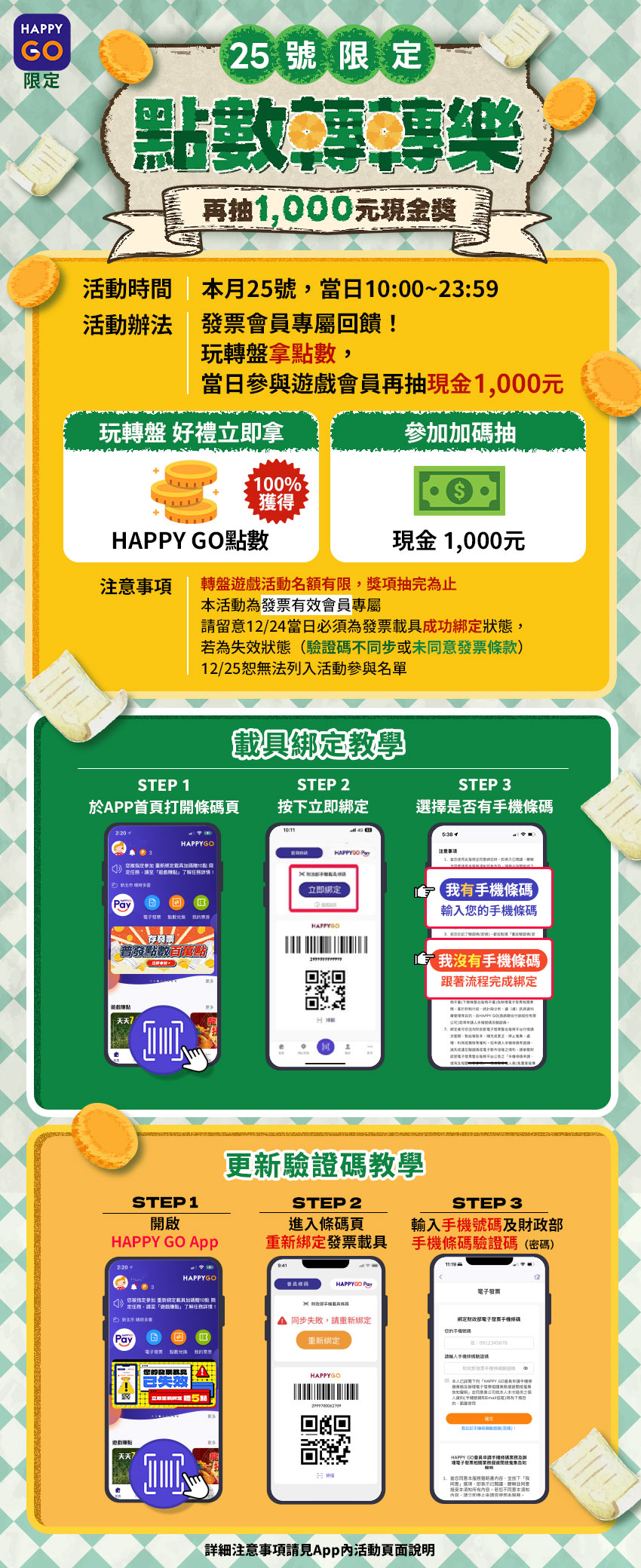 1. 僅限HAPPY GO App綁定發票載具會員參與,請於活動開始前下載App並完成註冊與綁定流程。