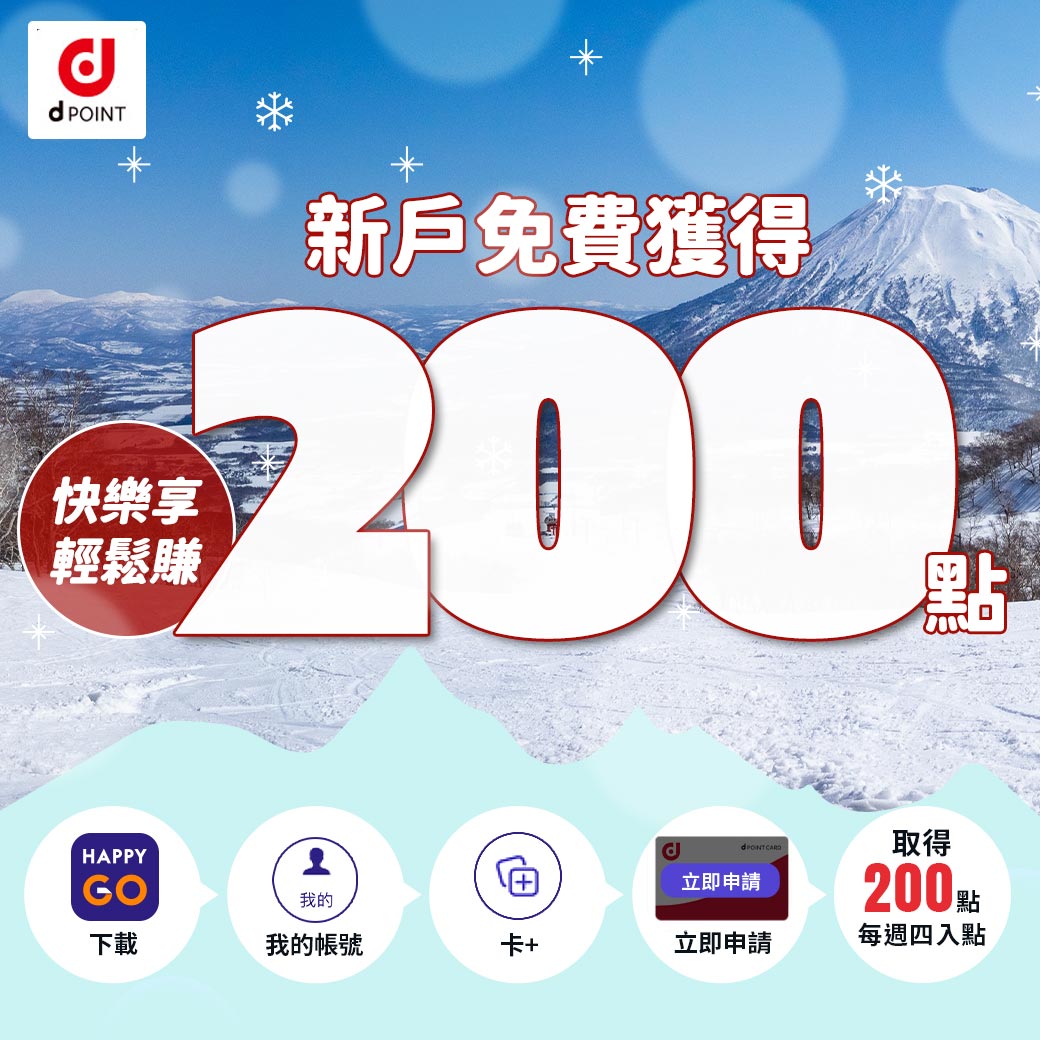 至HG APP「我的帳號」👉「卡+」👉「申辦d POINT」 👉 獲得HAPPY GO 100點 + d POINT 100點!