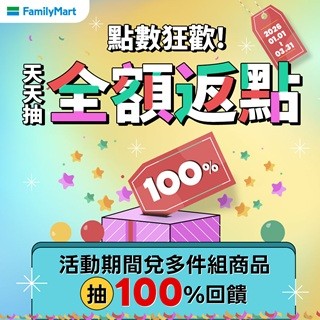 1.活動期間 即日起-2026/3/31於HAPPY GO官網、APP,兌換全家2件組商品即可有機會抽點數全額返還,每一位卡友在活動期間可重複得獎,每月符合抽獎資格者,將於下月8號統一贈點,舉例:4月符合抽獎資格者,將於5/8統一贈點(遇假日提前)。