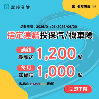 凡投保汽、機車險達贈點門檻,加碼抽HAPPY GO 1,000點 (每月10名,共60名)。