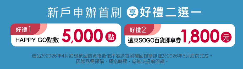 ■【Happy Go通路限定首刷禮】回饋與(或寄送)當日前,正卡申請人有以下情況者,即自動喪失參加本活動之資格,申請人所獲得之好禮回饋應於本行查明或知悉有該等情事時立即失效,申請人亦不得要求將好禮回饋折換現金或折抵消費金額。(1)信用卡(含正、附卡)遭強制停用、停卡、掛失不補發。(2)非持卡本人交易款項(如遺失被竊、偽卡交易、偽冒申請)。(3)持卡人有信用卡約定條款所列喪失期限利益等情事。