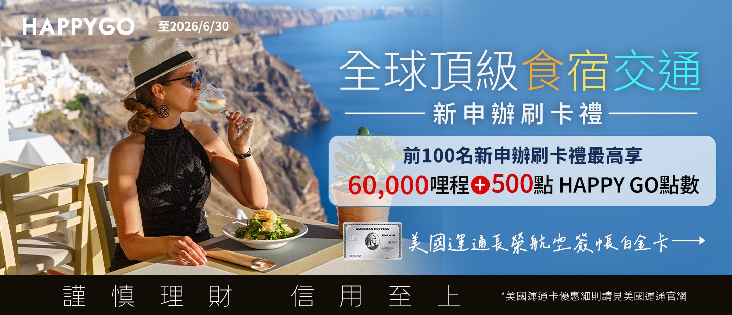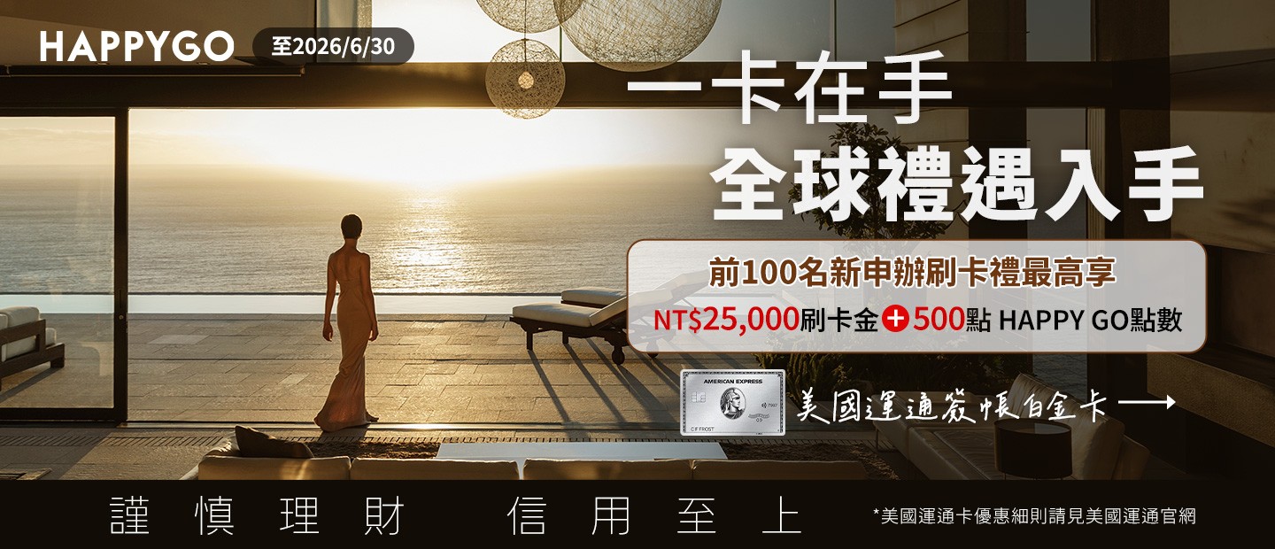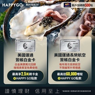 (1) 即日起至2026年6月30日(含)前透過HAPPY GO專屬連結線上申辦美國運通簽帳白金卡正卡或美國運通長榮航空簽帳白金卡正卡,依申辦後成功核卡之順序前100名享贈點500點;每人限回饋1次,合計100名得獎。