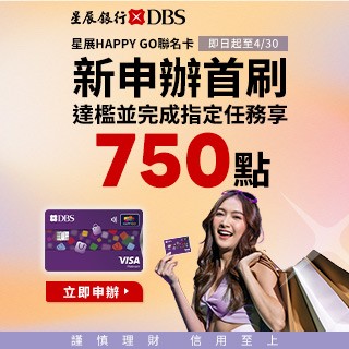 新戶申辦正卡並於核卡日後30天內完成註冊登入【星展Card+信用卡數位服務】及成功申請信用卡電子帳單,並累積一般消費達NT$1,000(含)以上,即可享750點HAPPY GO點數。